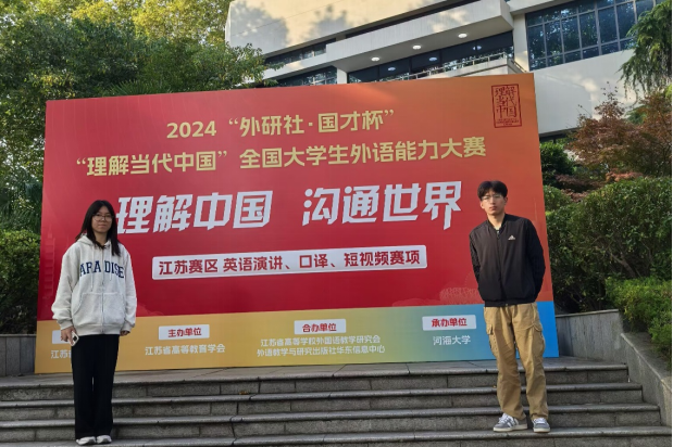 11月1至3日,2024“外研社·国才杯”“理解当代中国”全国大学生外语能力大赛中的口译比赛江苏赛区选拔赛在河海大学举行。经过校赛选拔,外国语学院英语1211班牛祥同学和1212班张文慧同学代表学校首次参加该赛项比赛。