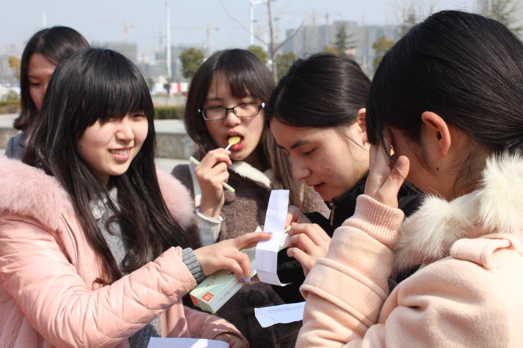 活动伊始,大家就跃跃欲试,纷纷试着将沙包投落在标记一二三等奖的饼状图,沙包出手后伴随着尖叫声落地,女生们玩得风风火火,便利贴、签字笔和糖果等奖品被一样样拿走,不大的活动场地充满了欢笑,路过的男生也忍不住驻足观看。不时有女生过来参与活动,许愿墙上也贴满了花花绿绿的便利贴,“脸瘦一点”“长高长高”,一张张写着心愿的便利贴让人从中感受到了女生节的气氛和女生的活力。在健康知识问答环节,国际学院的大三女生潘婷抽到了“女生在生理期不能干什么?”这一问题,围观的女生们都回答得头头是道,令人掩面而笑。芮莺美见状高兴地说:“我们举办这个活动就是为了能让更多的人注意到女生节,让女生在节日里能更开心。”