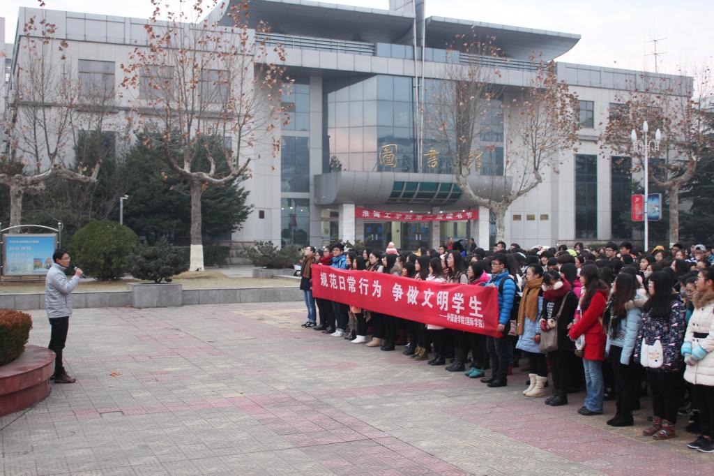仪式之后我院党委副书记何颖对学生进行了“规范日常行为,争做文明学生”的文明主题教育,他希望同学们能秉承淮工的精神,遵循淮工的校训,脚踏实地,努力将自己培养成社会的合格建设者和接班人。