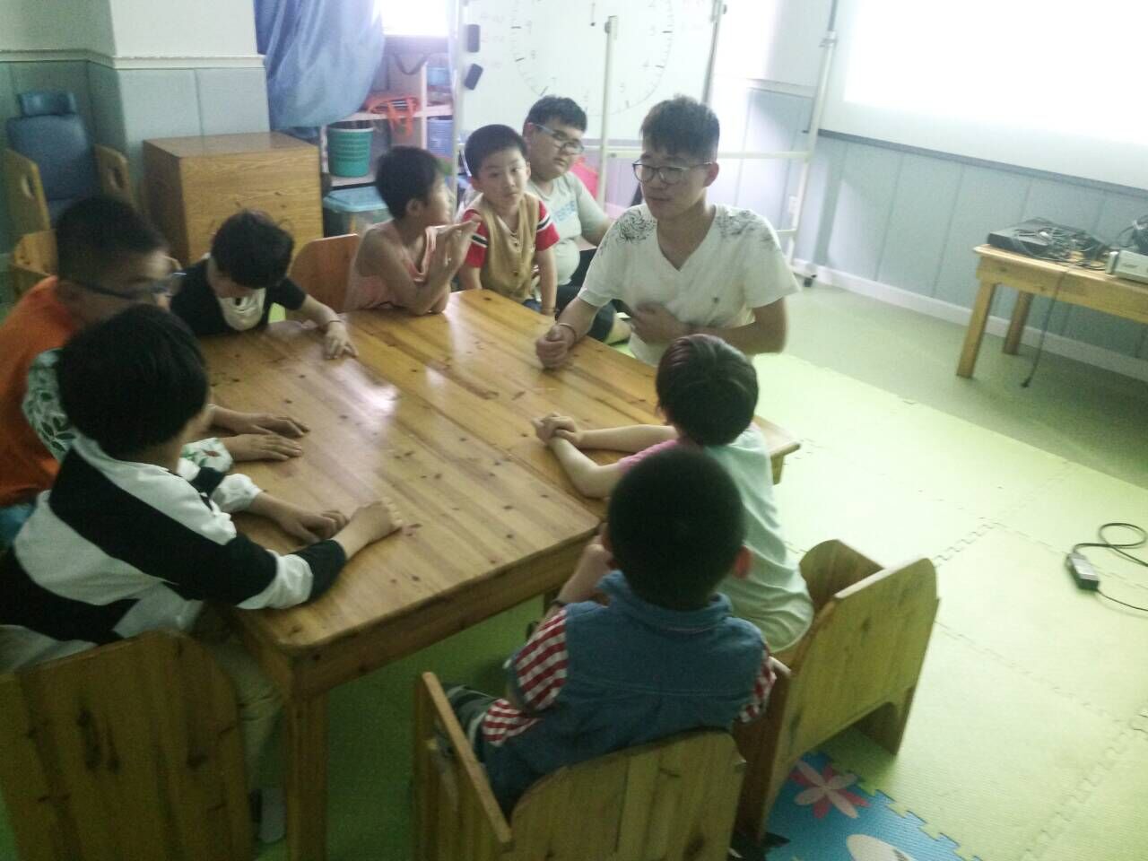 第二节课我们还教了他们一些简单英语字母,带他们复习先前学的“ABCDEFG”的时候,他们竟然能说出好几个,让我们很是兴奋,更加积极的教他们新的字母了。学完字母、简单的打招呼语后,我们还放了儿歌,带着他们学习一些新的内容,孩子们很是高兴。
