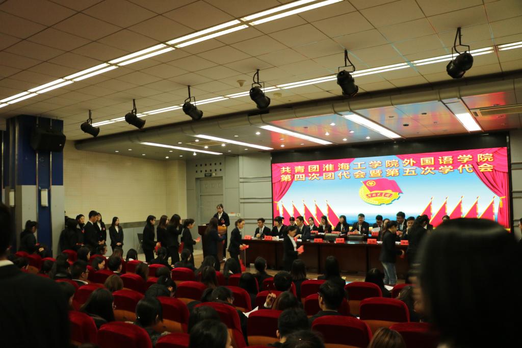 肩负八百三十余名团员青年的信任与重托,11月21日-22日,共青团淮海工学院外国院第四次团代会暨第五次学代会在艺术楼报告厅隆重召开。外国语学院党委书记赵宏,副书记、副院长何颖,校团委副书记朱小明,土木与港海工程学院团委副书记周琦,校学生会主席严文娟等出席会议。