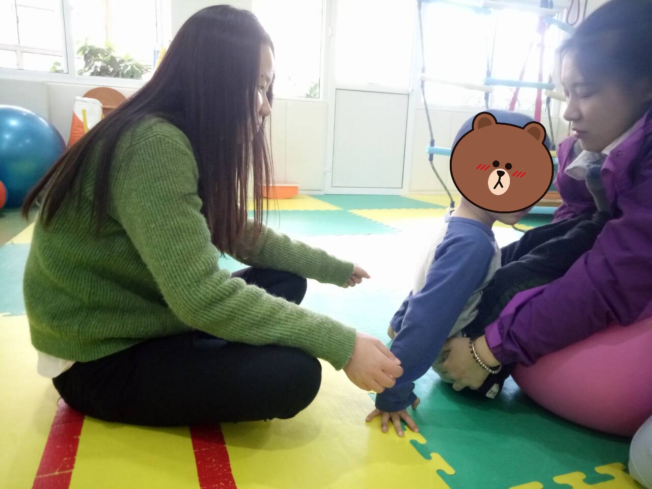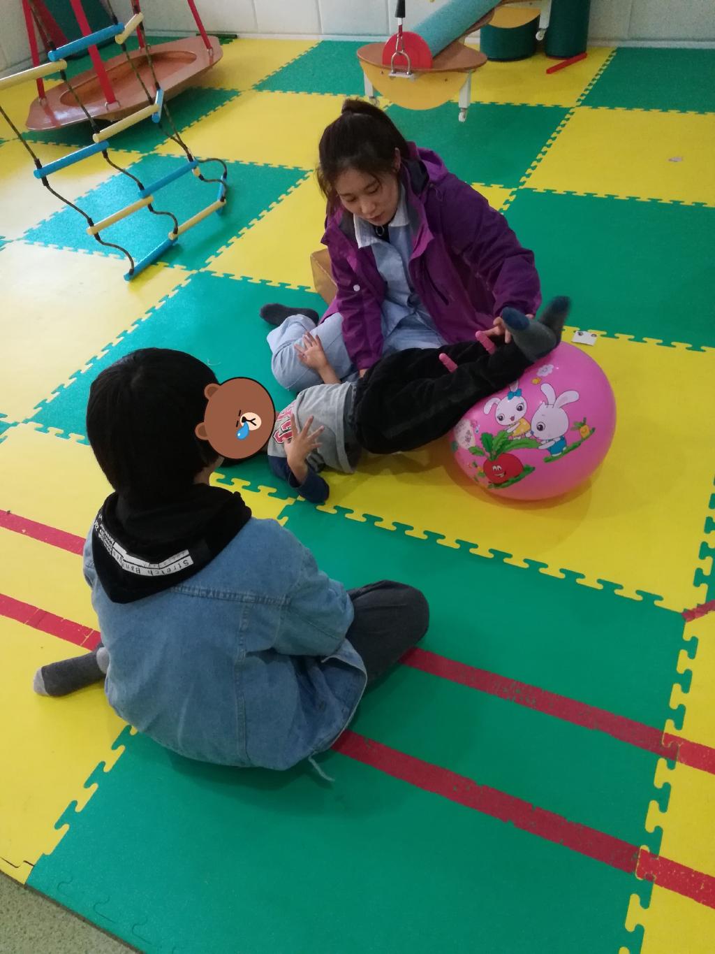 孩子训练特别努力。我们到的时候,正好他们在上课。我就旁观了一个小女孩的课。她的情况是无法控制自己腰的力量,所以她在移动的时候,身体会四处扭动,于是工作人员就拿一根绳子固定住她的一只脚,使她左脚屈起,右脚站直,然后努力保持平衡,坚持二十秒。其实对于她们来说,坚持二十秒都很艰难,那个小女孩总是把握不了自己身体的重心。