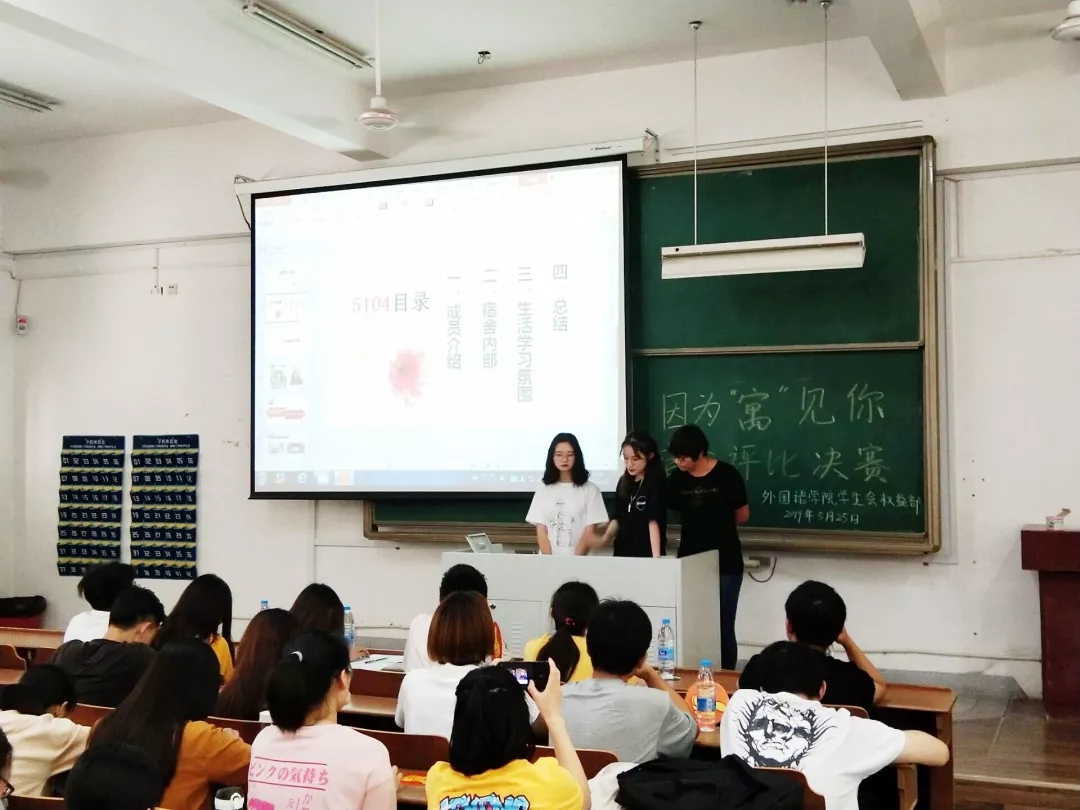 在活动中,各个宿舍的参赛选手依次上台进行答辩。所有的参赛宿舍都用心的准备了PPT,争取把宿舍最温馨美好的一面分享给大家。由外国语学院学生会权益部成员进行计时并且计算各个参赛宿舍的得分情况。