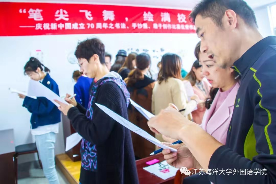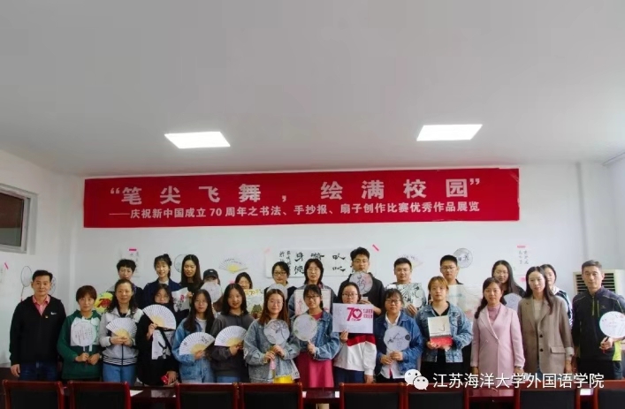 10月12日下午,由外国语学院团委宣传部主办的“笔尖飞舞,绘满校园”庆祝新中国成立70周年书法、手抄报、扇子创作比赛的作品于苍梧校区文渊楼269成功进行展览。活动现场邀请学院领导、党政办、教学办、辅导员等老师和海洋生命和水产学院学生团委副书记冷超凡同学前来参观并进行投票。