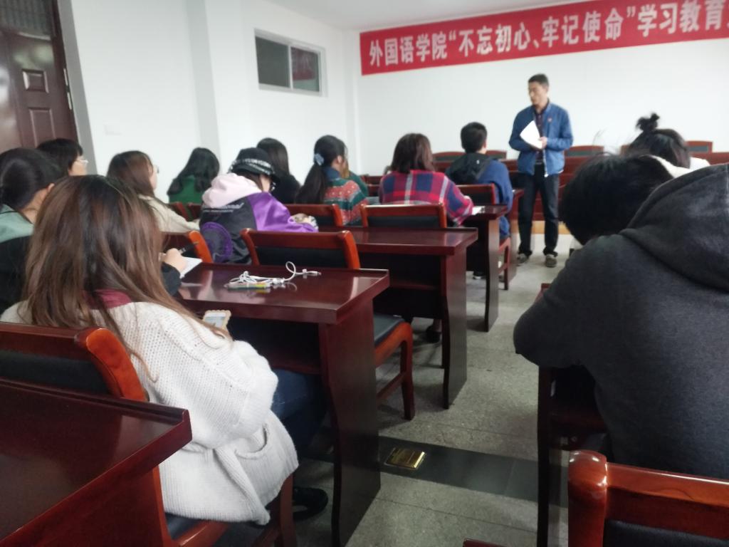 2019年10月25日下午,江苏海洋大学外国语学院在文渊楼269会议室举行“不忘初心、牢记使命”主题教育学生党支部成员集中学习研讨会。会议由学院党支部书记魏学庆主持,全体学生党支部委员参加了学习研讨。书记魏学庆首先带领大家再次学习了习近平总书记在“不忘初心、牢记使命”主题教育工作会议上的讲话,要求全体党员要充分认识开展主题教育的重大意义,要准确把握主题教育的总要求、目标任务,认真学习、深刻领会,主动作为。