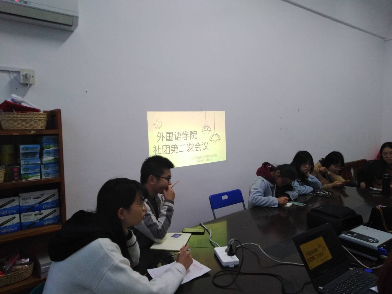 11月7日晚5时,外国语学院社团第二次会议在苍梧校区文渊楼275召开。参加此次会议的有:外国语学院各社团的社长,外国语学院学生会副主席兼社管主任朱亦丹,外国语学院新媒体主任孟祥玉。朱亦丹担任此次会议的主持人。