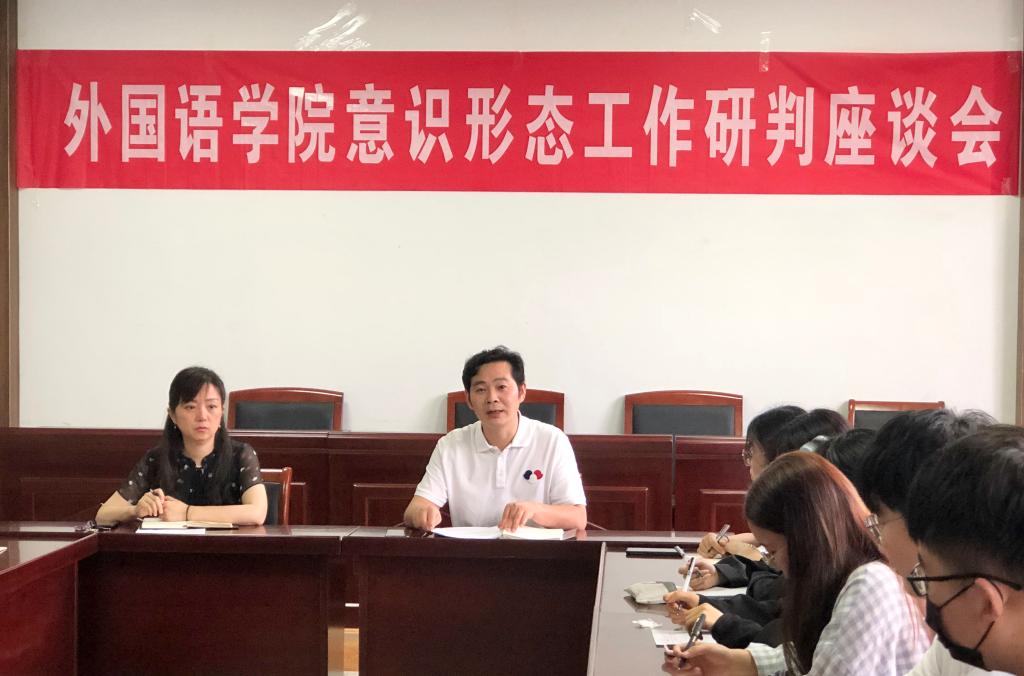 7月3日下午,外国语学院于文渊楼269会议室召开意识形态工作研判座谈会,会议由外国语学院党委副书记陆文前主持,党委书记徐岚、辅导员和团委学生会新媒体主要学生干部参加了会议。