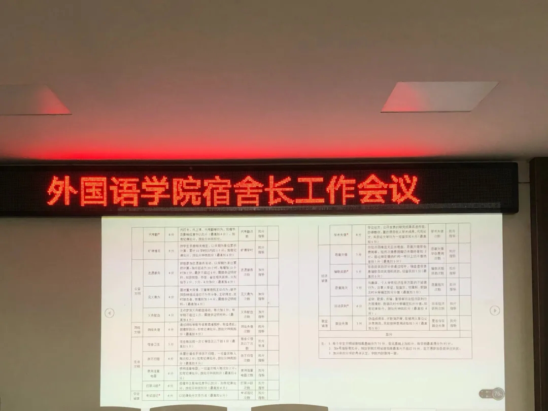 接着,她指出宿舍长要高度重视宿舍人员的心理状况与情绪波动情况,如果遇到突发事件,一定要及时上报学校。她希望各宿舍的学生们能够在宿舍长的带领下多包容,多沟通,遇到问题要讲出来,及时的解决。同时,宿舍长作为宿舍的一份子,更要积极协调矛盾。之后,团委副书记王熙给宿舍长分发了关于印发《江苏海洋大学学生文明诚信档案管理办法(试行)》的文件,并要求宿舍长认真阅读。接着,辅导员曹燕妮就心理健康上报表进行了说明与强调,她希望宿舍长和心理委员一起督促学生填写,及时汇总并上交。会议最后,党委副书记陆文前再次强调了以上宿舍问题对毕业与评奖评优的影响。他希望大家能够认真阅读文件,遵守学校制定的有关宿舍的规章制度。宿舍长积极履行自己的职责,认真处理人际关系,为自己的大学宿舍生活添彩。至此,本次外国语学院宿舍长工作会议圆满结束。