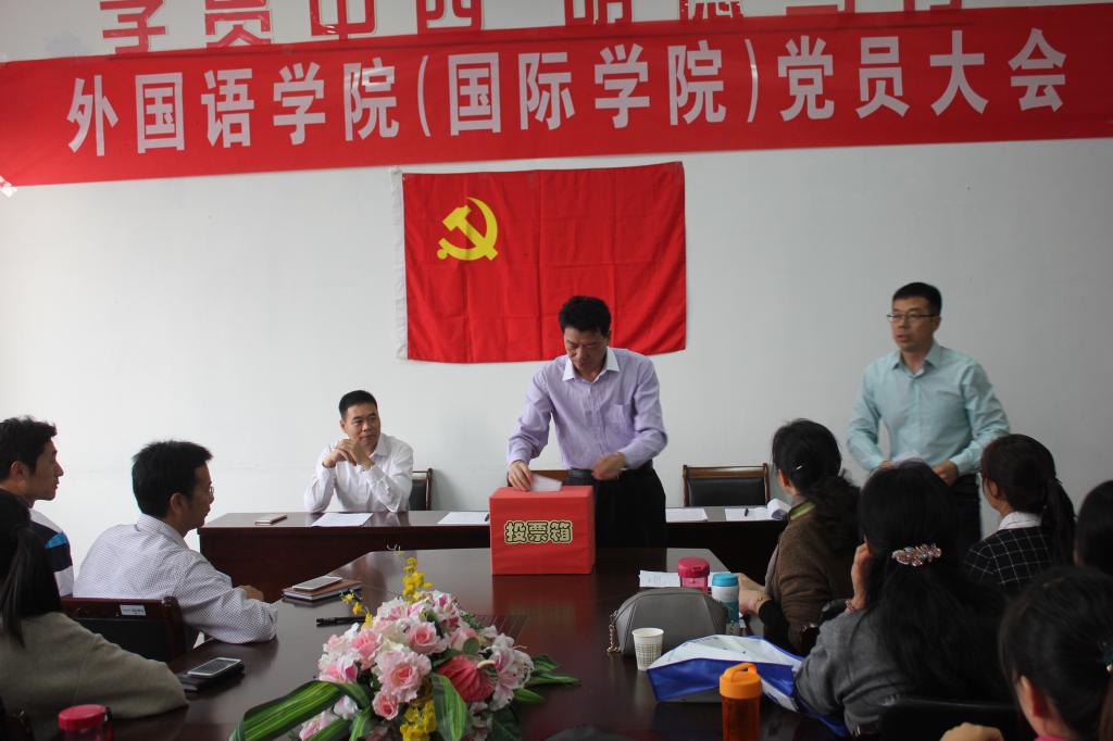 2015年10月下旬,外国语学院(国际学院)党委举行换届选举党员大会,学院全体正式党员参加会议,校党委组织部副部长张学武同志应邀出席,部分民主党派代表和预备党员列席会议。