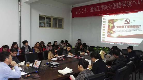 11月15日下午,外国语学院在文渊楼269会议室召开全体党员大会,赵宏书记带领学院全体党员一起学习了十九大新党章。