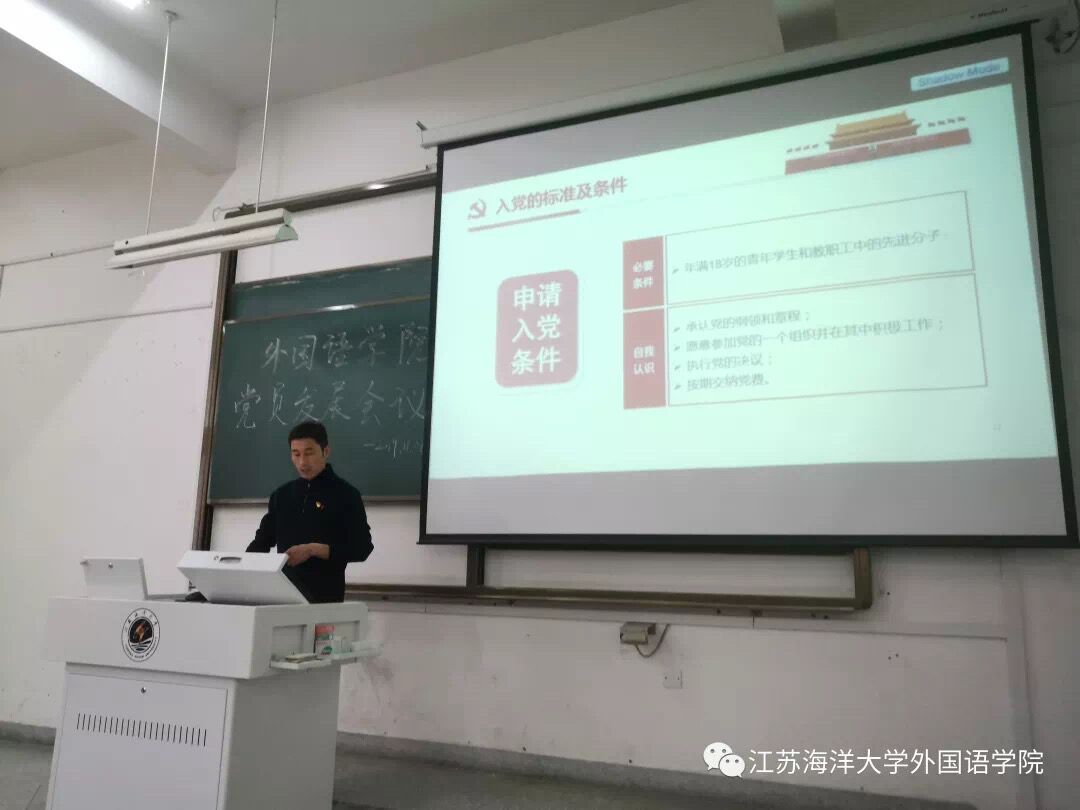 2019年11月6日16时,江苏海洋大学外国语学院在文通楼227举行学生党员发展工作程序说明会。说明会由学生第一党支部书记魏学庆主讲,2016级、2017级、2018级积极分子和团员青年代表100余人参加。