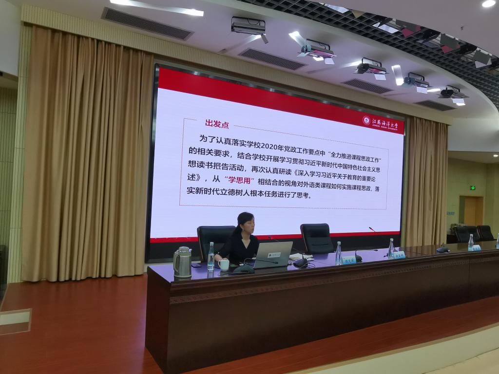 徐岚书记以“当德才兼备的好老师 做立德树人的‘大先生’”为标题,从六个方面进行了详细交流:1、读《深入学习习近平关于教育的重要论述》;2、外语类课程思政研究的现状及其必要性;3、构建“大外语”时代课程思政大格局;4、产出导向法(POA)与外语类课程思政建设;5、基于“产出导向法”(POA)的外语类课程思政构建路径;6、课程思政建设展望。徐岚以身作则,带头研究课程思政,以自己的备课实例,详细传授了自己如何把课程思政运用在授课中,强调了“学思用”。