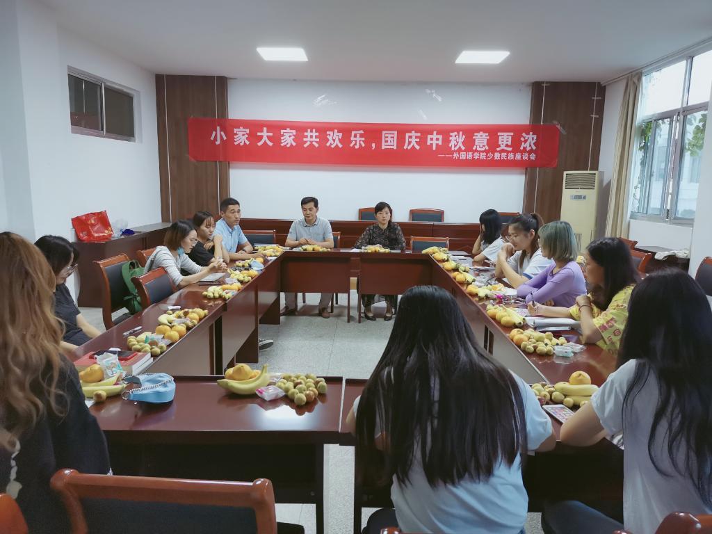 9月29日下午,外国语学院在文渊楼269会议室举行“小家大家共欢乐,国庆中秋意更浓”少数民族学生交流会。学院党委书记徐岚、副书记陆文前,辅导员魏学庆、王熙、曹燕妮,学生党员代表,及少数民族学生参加。魏学庆主持交流会。这也是一次特殊的党日活动。