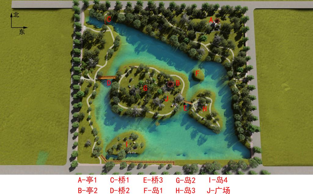 整个景观(湖),以及区域内的一个广场、两座亭、三座桥、四个岛(见附件1中的标注)。