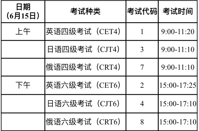 考试时间为6月15日,开考科目为英语、日语和俄语四级和六级。