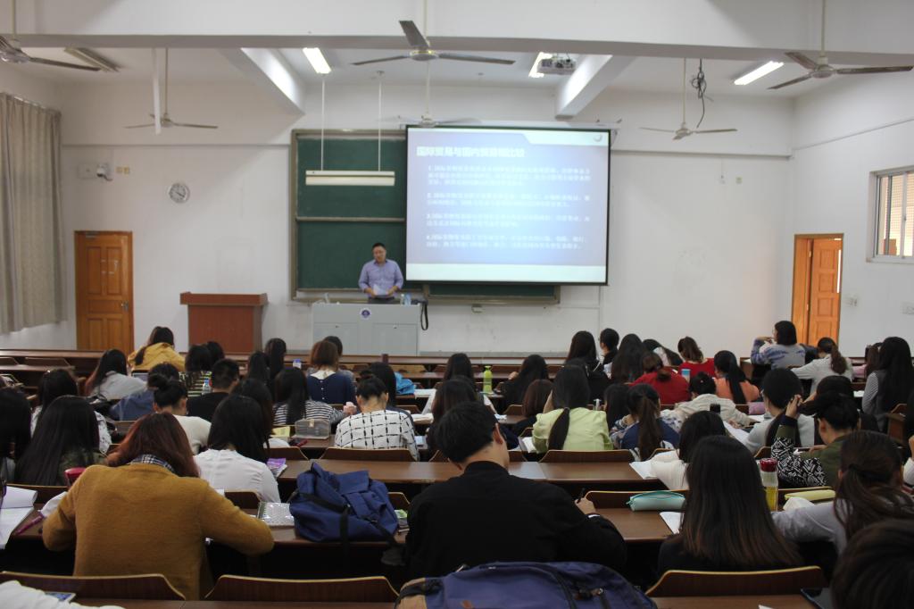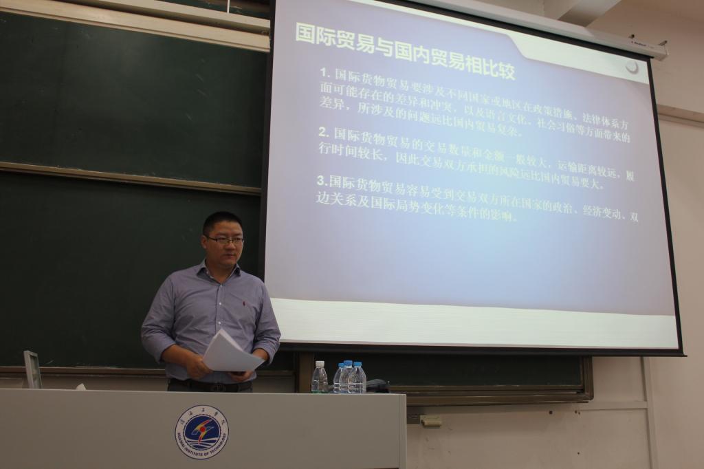 上课开始,韩晓马学长就什么是国际贸易,国际贸易的相关职位以及做外贸工作的优势进行讲解,并从国家文化、贸易数量和金额、政策和交通四个方面,把国际贸易与国内贸易做了对比,并且以自己的工作经历来为同学们讲述了国际贸易的兴衰成败。