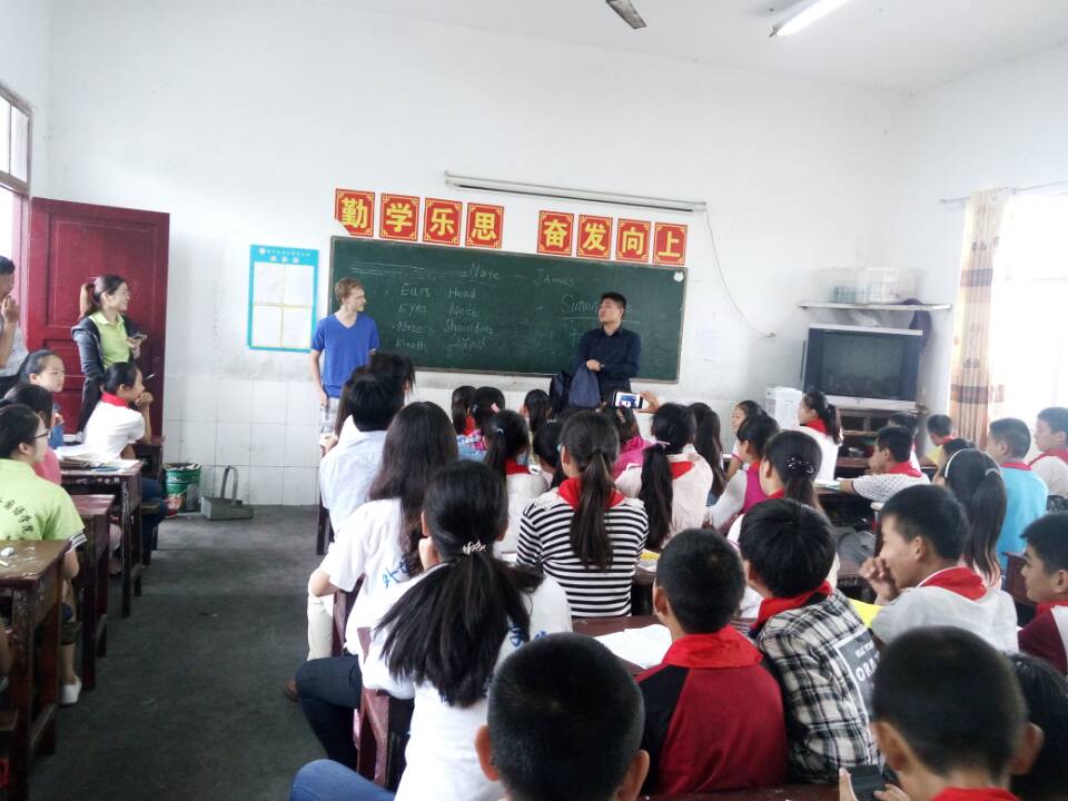 一天中的第一节课同样是在孩子的你追我赶跑进教室里开始,不过今天不同的是走近我们教室的还有一位超帅的美国朋友。孩子们对美国朋友的到来既好奇有期待。这也是小朋友们第一次近距离的接触外国人。他走进每一个班级,结合游戏,舞蹈,教孩子们英语,孩子们也配合的很默契,学的很快,期间有个小插曲不得不提,老外写错一个汉字,有个平时很调皮的男生竟然主动走上讲台帮助他改正,当时看到这一幕,真的很欣慰,还有佩服。课后志愿者们偷偷听到,校长给同学们开会,仿佛外教曾经是留守儿童可望而不可及的梦,有许多志愿者偷偷的流眼泪。在外国语学院再普通不过甚至于不屑的一堂外教课,竟成了留守儿童眼里最羡慕最渴望的梦。