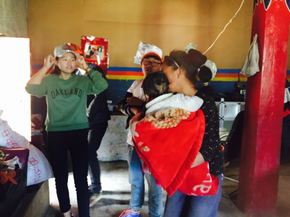 “哇”一声孩提的哭声冲破了原来的狗吠,阿旺卓嘎不好意思的低下头,告诉来访的老师:“老师,我弟弟哭了,我进去看一下。”跟随她的脚步,我们走进她的卧室,一个襁褓中的婴儿正在哭泣,她赶紧小跑过去,像妈妈一般哼唱着儿童歌谣,“乖,不哭,姐姐来了呢。”环顾四周,没有装饰,四面都是土墙,唯一的家具就是一个做饭的炉子,墙的北面的是一尊佛像,点着一丝灯光。这么大的哭声并没有引来孩子的父母,在心里,我们认为他们下地干活去了,但是内心还是忍不住好奇问了一下:“你爸爸和妈妈呢?”瞬间感觉到这个孩子内心的纠结,没有看我们镜头,向院子晒着的菌菇走去,低声说的说:“妈妈去送哥哥上学了,没有爸爸。”我们一阵沉默,不知道该如何弥补自己因为好奇而犯下的错误,引起小小孩子内心的翻涌。