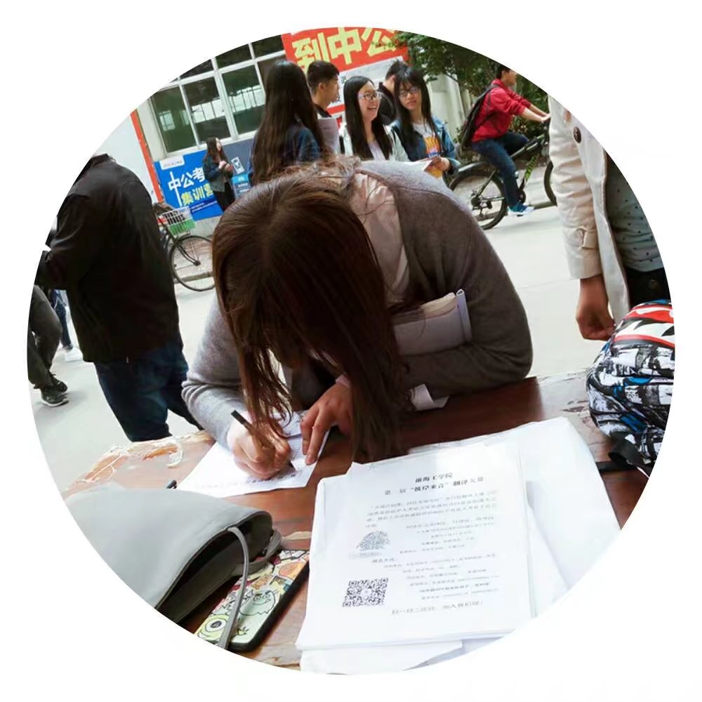 活动前期,会长陈信宇带领我社成员积极筹划,办公室组成员精心策划了整场活动,宣传组在官微和官Q等平台上做了大量宣传,以此确保报名工作顺利完成。在报名活动现场,各个学院同学更是络绎不绝争相参赛,展现出了我校学生对翻译事业的热爱,截止今天已有60多名同学报名参加。