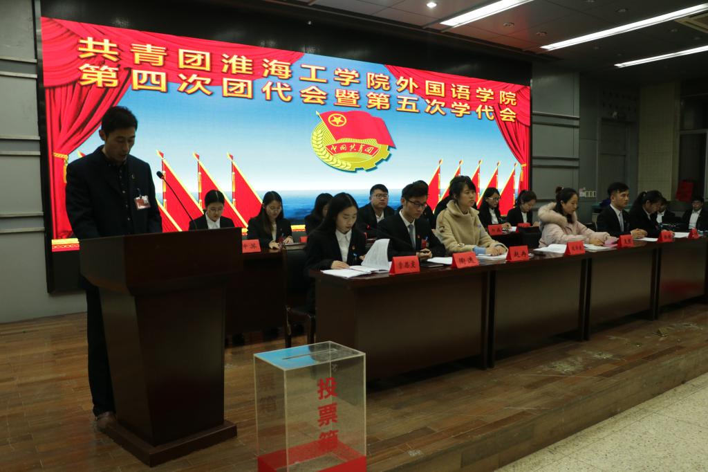 肩负八百三十余名团员青年的信任与重托,11月21日-22日,共青团淮海工学院外国院第四次团代会暨第五次学代会在艺术楼报告厅隆重召开。外国语学院党委书记赵宏,副书记、副院长何颖,校团委副书记朱小明,土木与港海工程学院团委副书记周琦,校学生会主席严文娟等出席会议。