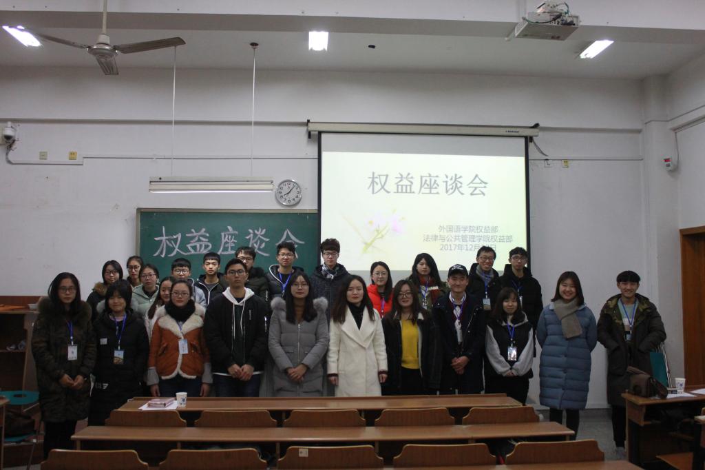 12月12日晚19点整,由外国语学院学生会权益部以及法律与公共管理学院学生会权益部合办的权益座谈会在文通楼115顺利举行。出席本次座谈会的有法律与公共管理学院团委副书记辅导员赵亚婷老师、法律与公共管理学院学生会副主席唐珊、外国语学院学生会秘书长郑磊以及两院权益部所有成员和各班代表。同时,罗梓文、许楷宇和张尚蕾三位干事代表校权益部参加本次会议。本次座谈会由法律与公共管理学院权益部副部长张怡和外国语学院权益部副部长刘晗主持。