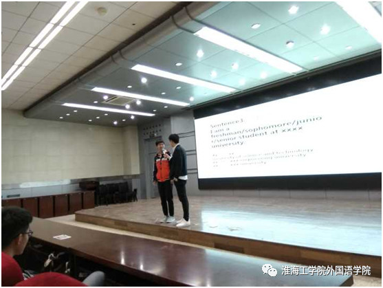 在讲座中,李老师分模块和同学们分享了应试的技巧。“来一位同学上台来做一个20秒的英文自我介绍。”土木与港海学院的一位穿黑色衣服的男同学在台上自我介绍的时候,讲一句停几秒,最后偏过头笑了。李老师指出了他自我介绍中存在的问题,然后展示了一些在口语考试中常用的句子。在作文的讲解中,李老师举了“小心夹手”、“无障碍电梯”、“爱心专座”等日常生活中经常用到的短语翻译的例子来告诉同学们:要用英语思维去翻译,写出流畅和地道的英语作文。面对听力这座“大山”,李老师指出同学们在英语发音方面的问题,带领大家学习了一些发音规则。然后分享了一个提高听力的学习方法:“大家在做卷子的时候,把听力反复听,边听边看,也可以做一些听写。”