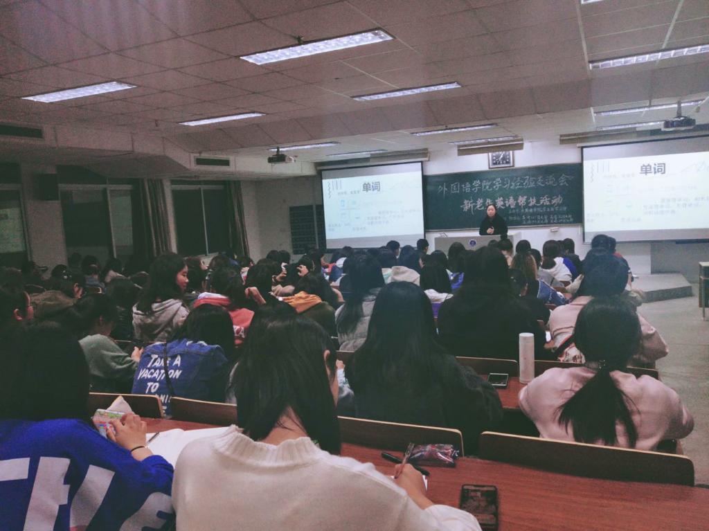 活动开始前,同学们已经早早地来到了教室,有序就坐后安静地等待着活动的开始。“欢迎来到外国语学院学生会学习部学习经验交流会,希望本次活动能给同学们提供一个与高年级学姐交流的机会。”主持人许继月首先开场说道。首先上场的是英语161班的秦子然,她向在场的学生们推荐了一些关于听说读写的实用软件。她在介绍单词软件时说道:“查单词的时候不仅要重视中文的解释,也要注意英文的注释。”现场的同学们听得津津有味,纷纷拿起手机拍照记录,并在本子上迅速地做好笔记,生怕遗漏掉重要的知识点。在接下来的答疑解惑的环节,同学们都积极地举手提问。有同学提问道:“学姐,你大一的时候是不是经常去图书馆啊?”秦子然学姐回答说:“大学生宿舍是容易放松懒惰的地方,我没事的时候就会去图书馆学习,希望你们也多去图书馆感受学习的氛围,这有助于你们提高自己的成绩。”