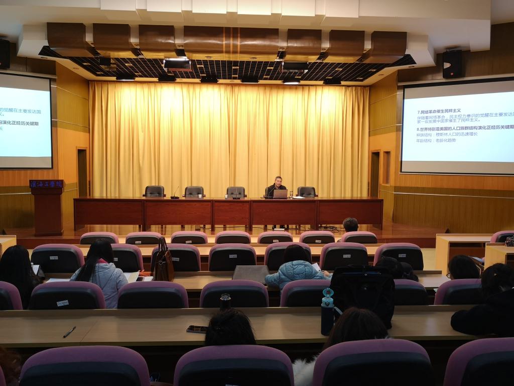12月5日下午14:20,外国语学院诚邀马克思主义学院党总支书记张学武,在讲堂楼报告厅,为学院全体教职工、党员作了题为《从世界之大变局看中美贸易争端》专题报告。外国语学院党委书记赵宏主持报告会。