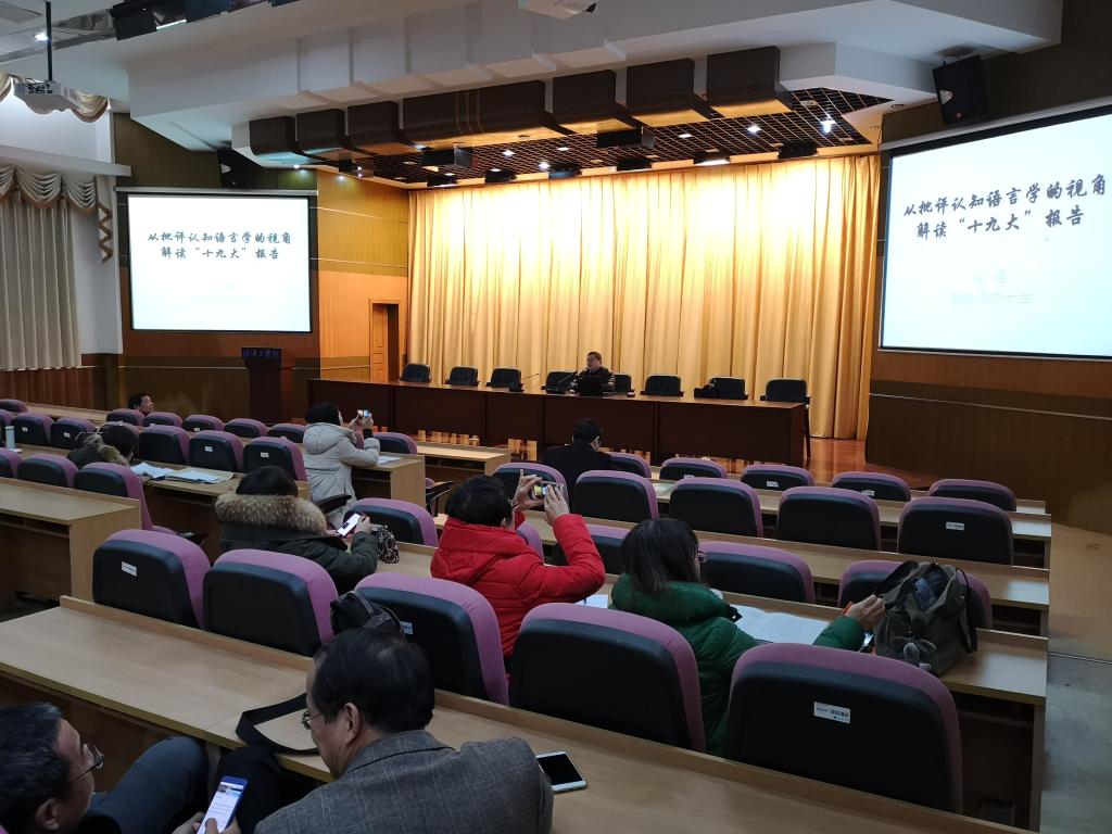 第一场讲座题为“从批评认知语言学的视角解读‘十九大’报告”。讲座从批评认知语言学解读政府工作报告,视角新颖,给人一种耳目一新的感觉,同时也富有深度,让聆听者深受启发。讲座主要从认知语言学和批评话语分析理论体系中的社会转向为切入点,基于语料库实证实例分析了中‘十九大’所使用的话语策略。讲座指出“十九大”报告主要基于两大隐喻场景,其一是“中国共产党人的任务是目标明确的征途”(Journey);如“我们都在努力奔跑,我们都是追梦人”等。其二是“我党是一个人体”,如有“刮骨疗毒”等表达。