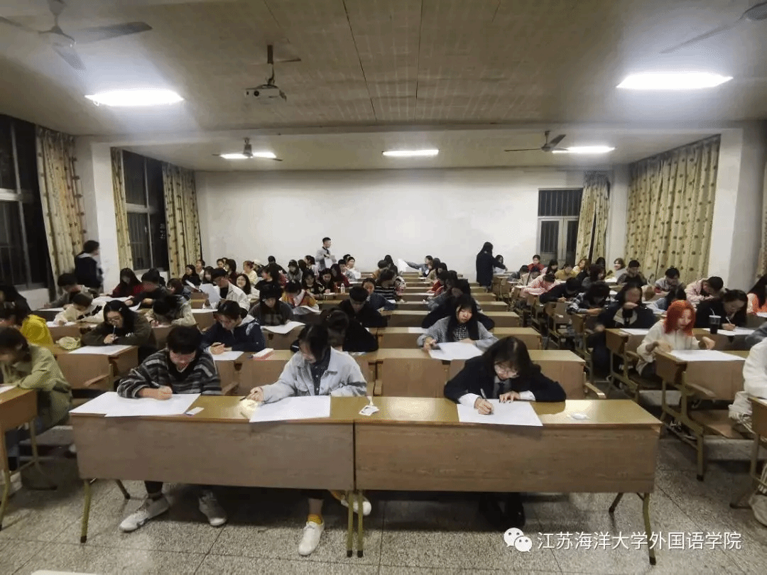 2019年10月20日晚七时十分,江苏海洋大学外国语学院2019级学生手册考试在通灌校区和苍梧校区顺利进行。
