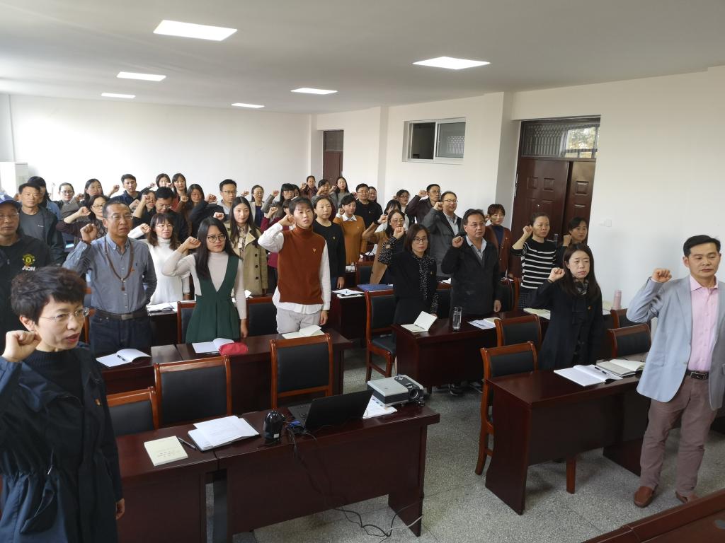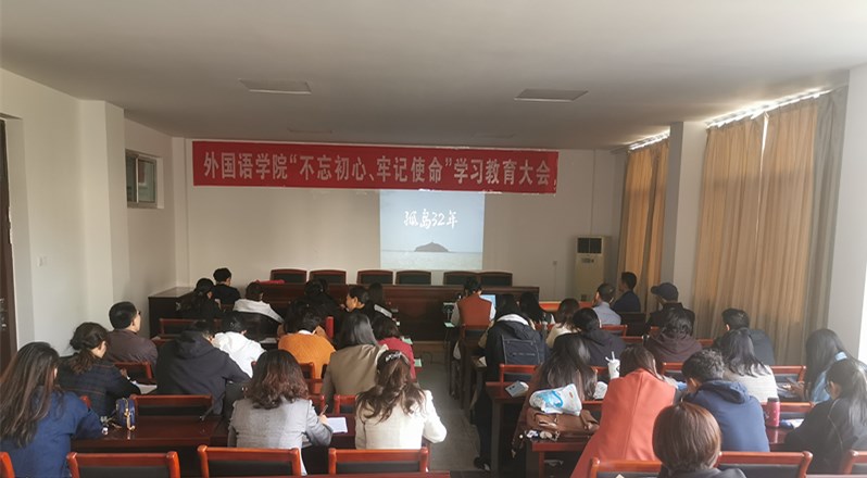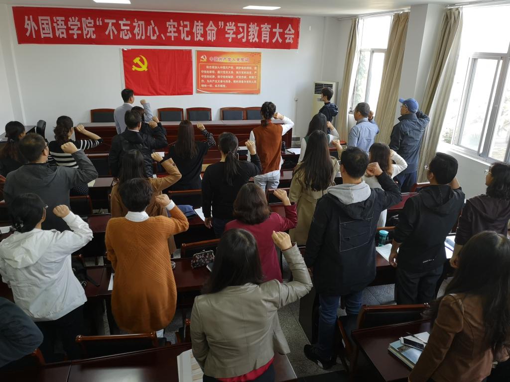 10月23日下午,外国语学院在文渊楼269室召开全体党员大会,扎实推进“不忘初心、牢记使命”主题教育。本次活动由两个部分组成:“不忘初心、牢记使命”主题教育大会和“三问”讨论交流会。