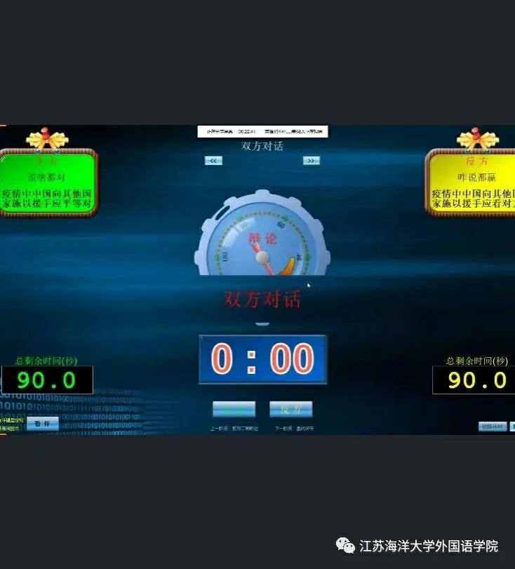 海环院现任辩论队领队艾志辉担任本次辩论赛主席,介绍完赛制后,辩论正式开始。外国语学院正反方辩手各就各位,拉开了比赛的序幕。正方辩题为“疫情中,中国向其他国家施以援手应平等对待”,反方辩题则是“疫情中,中国向其他国家施以援手应看对方对待中国的态度”。