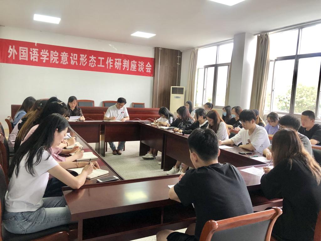 7月3日下午,外国语学院于文渊楼269会议室召开意识形态工作研判座谈会,会议由外国语学院党委副书记陆文前主持,党委书记徐岚、辅导员和团委学生会新媒体主要学生干部参加了会议。