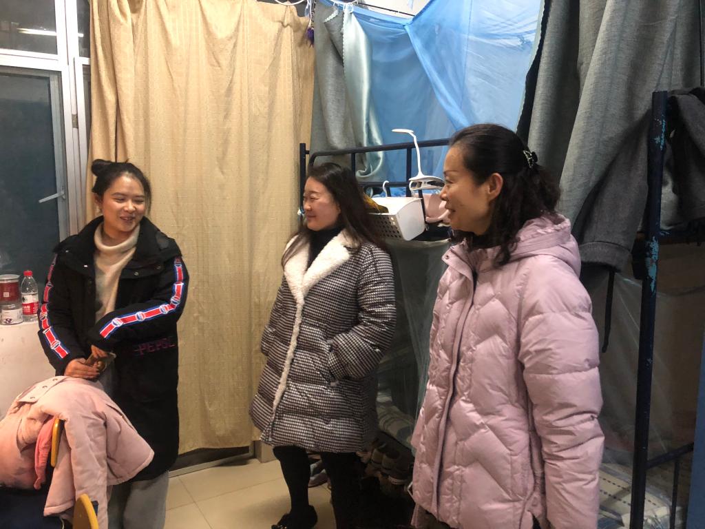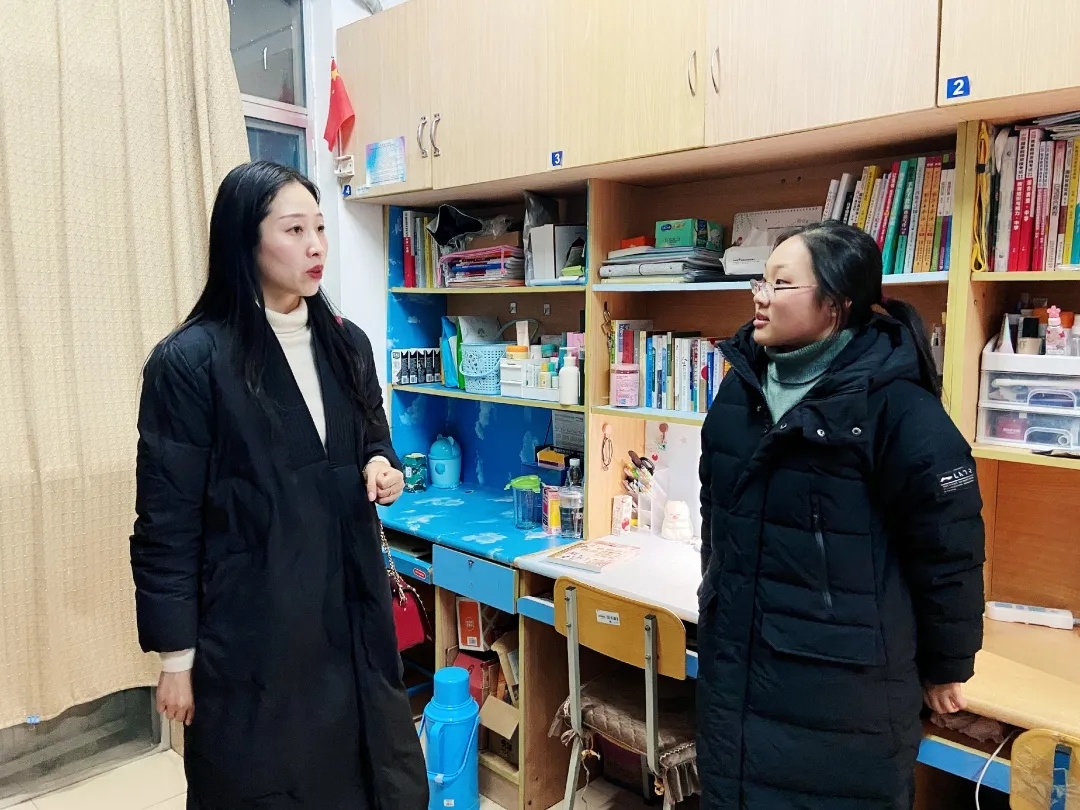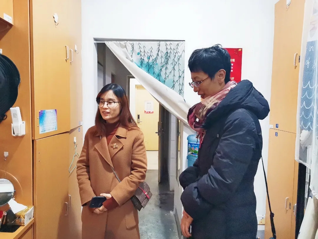 与此同时,我院院长赵晶辉带领部分班主任走访了A1楼学生寝室。走进干净整洁的寝室,老师们关注每一位同学的情况,叮嘱同学们认真准备各项考试的同时也不能忽视寝室卫生问题。她还提到冬季是疫情高发期,一定要及时开窗通风,保证寝室内有新鲜的空气流通。