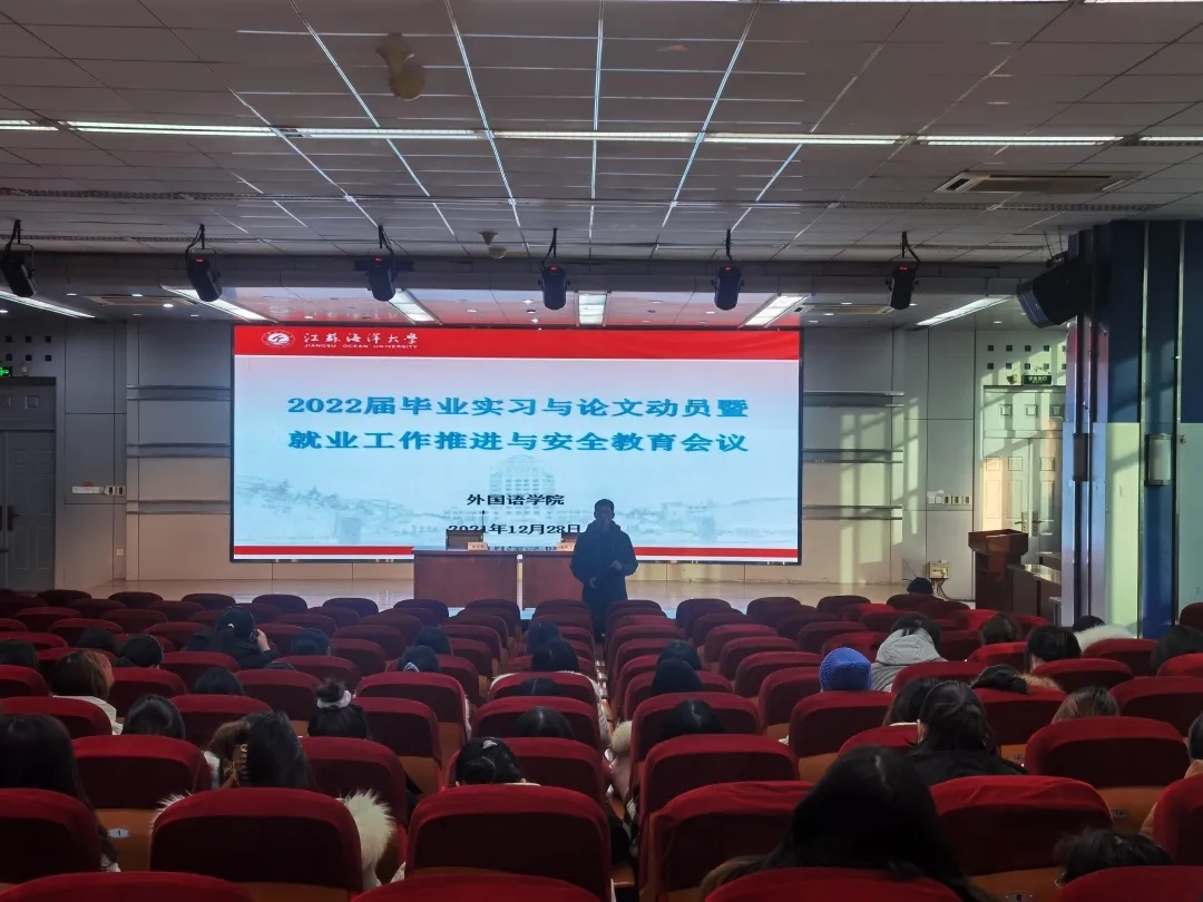 为了有效落实外国语学院2022届毕业实习与论文工作,确保论文开题等相关事宜顺利实施,同时促进学院毕业生的就业动力、提升毕业生的就业意识,12月28日下午3时,外国语学院于苍梧校区艺术楼一楼报告厅举办了2022届毕业实习与论文动员暨就业工作推进与安全教育大会。学院副院长吴美玉主持大会,学院党委副书记陆文前,毕业论文指导老师、各系主任、教研办主任冯慧华、学工办主任魏学庆,以及学院全体大四学生参会。
