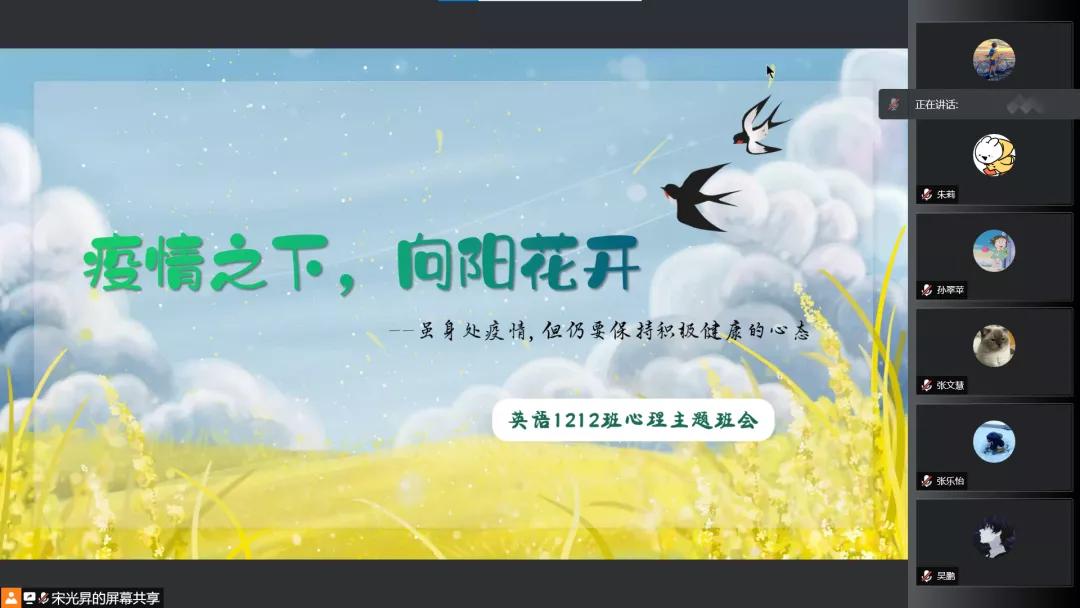 2022年3月10日至13日,外国语学院“疫情之下,向阳花开”心理主题班会以线上形式在各班陆续召开。本次活动由外国语学院心理协会组织举办,各班心理委员主持,全体学生参与。