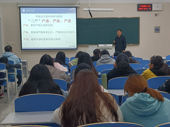 会议伊始,张勇首先对学生们到来表示热烈欢迎并介绍本次会议的主要内容。本次会议主要分为两部分,一是分析当前毕业生所面临的就业形势;二是讲解毕业论文的相关事项,如:撰写目的、指导工作的时间安排以及论文撰写的基本要求。会议中,张勇讲到,毕业论文是高等学校培养高素质综合型人才的重要实践教学环节。毕业论文坚持“三严”原则:严肃、严格、严谨。根据教育部本科毕业论文(设计)抽检办法最新文件,张勇再次强调了论文的真实性和规范性;接着,简述了论文工作的主要环节:分为选题、任务书、开题报告、撰写提纲、第一稿、中期检查、第二稿、第三稿(定稿)与答辩。“论文不仅仅作为一个实践教学环节,它还是高校实现人才培养目标的重要手段,是学生四年所学知识的深化和升华的重要过程。”张勇说到。