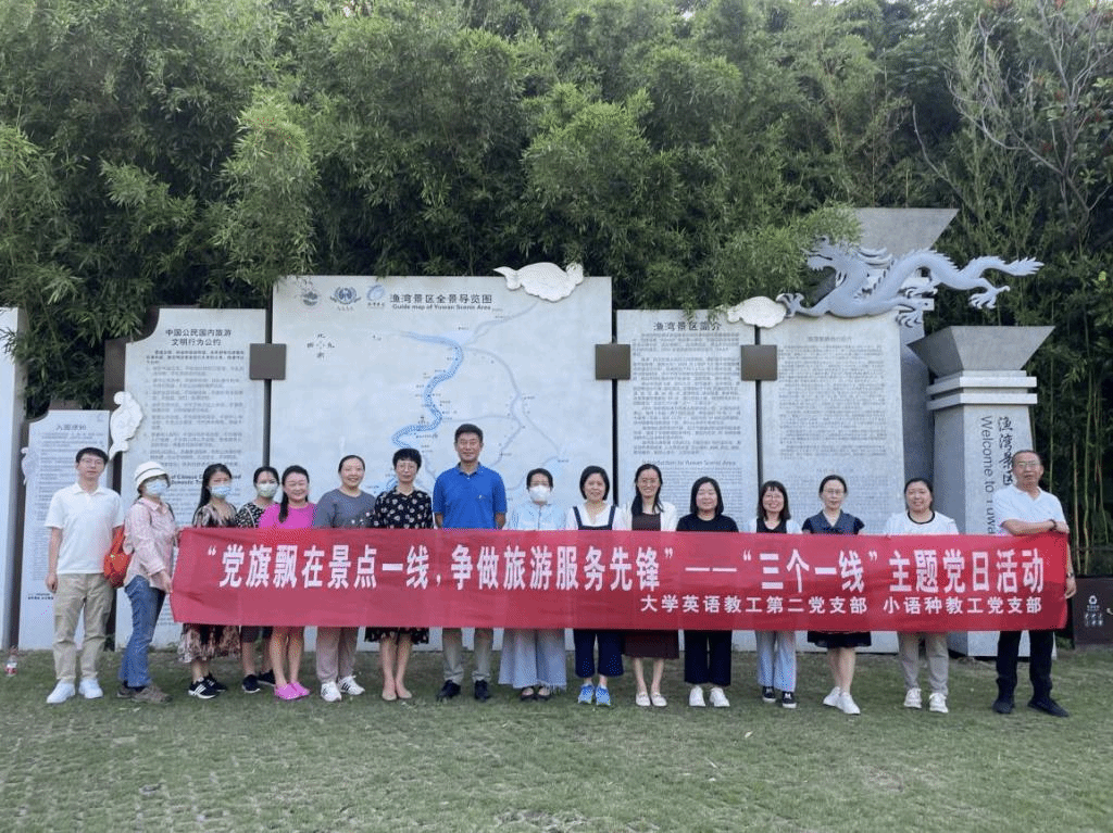 为深入开展学习贯彻习近平新时代中国特色社会主义思想主题教育,充分发挥党支部战斗堡垒作用和党员先锋模范作用,以实际行动落实主题教育“三个一线”行动要求,7月5日下午,外国语学院小语种教工党支部和大学英语第二教工党支部赴渔湾风景区联合开展“党旗飘在景点一线,争做旅游服务先锋”主题党日活动。学院党委书记田德勇和院长赵晶辉参加此次活动,两个支部的教工党员们结合自身业务知识,通过志愿服务的形式围绕景区旅游标识牌的翻译问题提出相应的意见与建议,以助力景区语言服务。