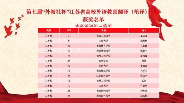 为培养和发现更多的高端翻译人才,推动翻译学科的飞跃发展,更好服务国家“一带一路”倡议,由江苏省高等教育学会指导,江苏省翻译协会、江苏省高等学校外国语教学研究会、上海外语教育出版社主办,苏州大学应用技术学院承办的第七届“外教社杯”江苏省高校外语教师翻译(笔译)大赛于11月27日圆满结束。外国语学院焦优平老师荣获本科英语组三等奖。