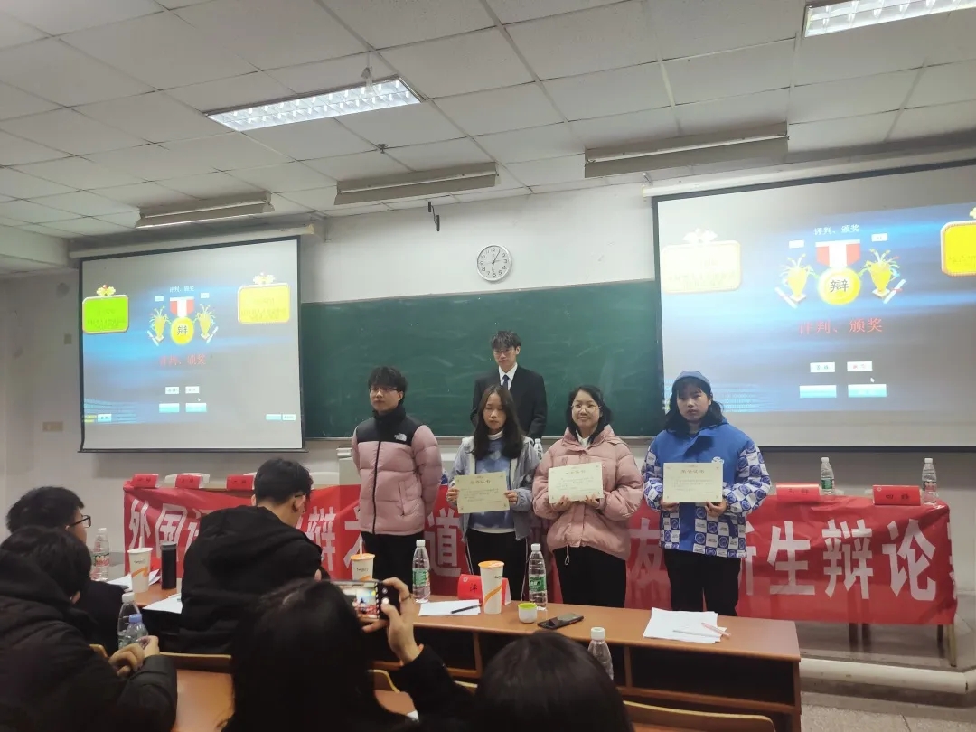2021年12月4日下午4时40分,外国语学院“以辩会友,辩之有道”新生辩论赛第二场在通灌校区至善402正式拉开帷幕。机械工程学院辩论队领队卢相东、环境与化学工程学院辩论队队长罗宇荣、海洋科学与水产学院辩论队队长邵霄威、环境与化学工程学院辩论队领队应志豪、计算机工程学院辩论队领队吴文文出席比赛并担任评委。本次决赛由正方日语1212班对阵反方日语1211班,围绕“专精型人才和综合型人才哪个更能促进当代社会发展”展开辩论。正方持有的观点为:专精型人才更能促进当代社会发展。反方则认为:综合型人才更能促进当代社会发展。经过一番激烈的辩论,最终由日语1212班取得决赛胜利,日语1212班刘姝彤获得最佳辩手奖,日语1211班王阳明月获得最具风采奖。辩论赛最终以日语1212获得冠军、俄语1211获得亚军、日语1211获得季军、英语1211、英语1212、朝鲜语1211获得优秀奖的成绩告终。