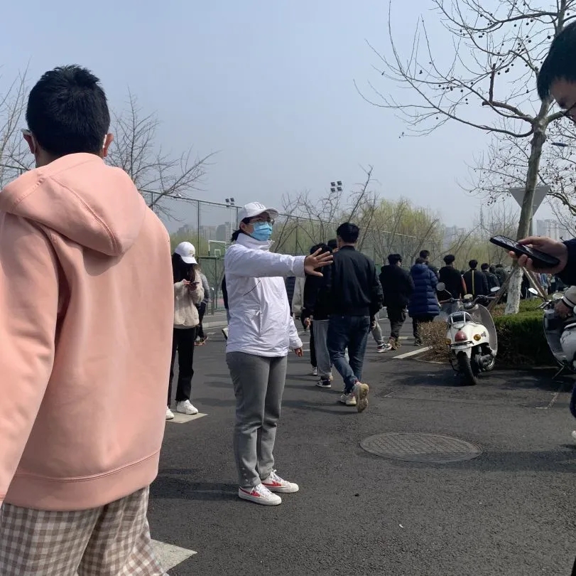 校园学生人数众多,队伍过长,匡老师需要一遍又一遍地控制间距,不断地用喇叭喊着“有序排队,间隔一米。”在每个路口关卡,匡老师还要随机应变,视队伍情况安排学生行进速度。