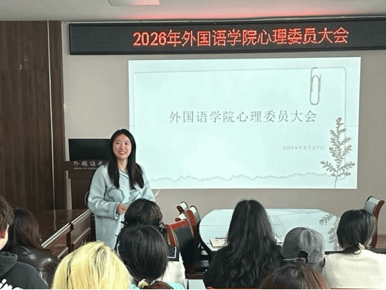 为加强春季学生情绪健康防护工作,保护学生心理健康,2026年3月27日下午4时,外国语学院心理委员大会于文渊269会议室顺利召开。此次会议由外国语学院辅导员匡冬青担任主讲,外国语学院全体心理委员参与会议。