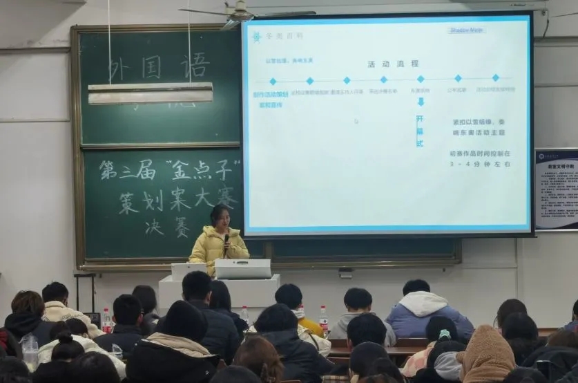 为使学生们展现自我组织策划方面的能力,丰富学生们的课余生活,12月10日晚7时,外国语学院学生会办公室举办的第三届“金点子”策划案大赛决赛于文通楼224顺利开展。本次决赛通过演讲的形式进行,由办公室干事赵博主持,各办公室副部及干事共同领导协作。
