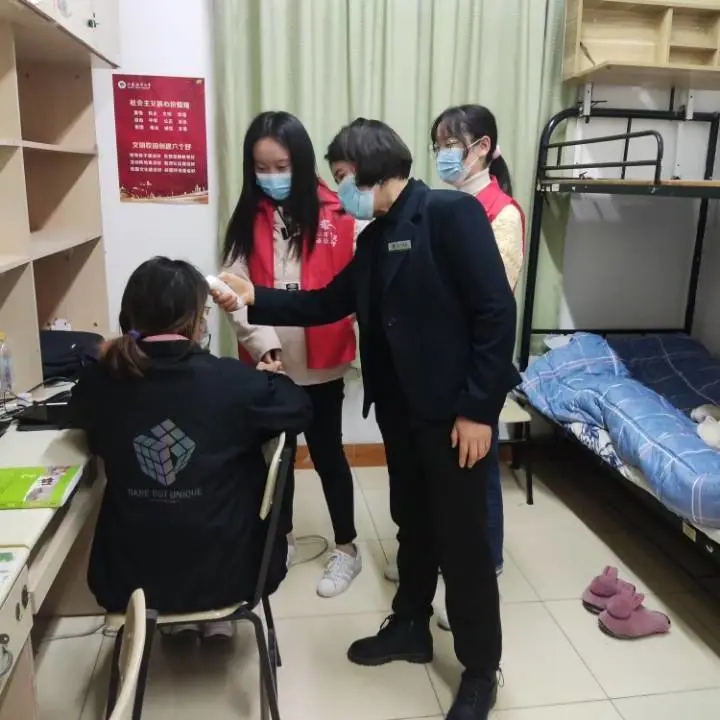 外国语学院由日语1211班班长潘蕊带领的疫情防控小队,为其所在的锦绣5号楼的疫情防控工作做出了不可忽视的贡献。在宿管阿姨的帮助下,该小队探望了因轻微发烧而单独在5425隔离的同学,几位志愿者先是严谨地为宿舍消了毒,并贴心地送去了生活必需品。