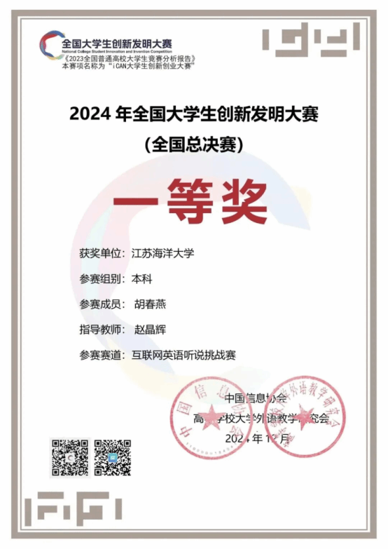 全国大学生创新发明大赛听说挑战赛全国一等奖