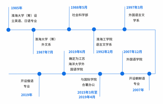 江苏海洋大学外国语学院肇始于1985年淮海大(筹)设立的英语、日语专业,历经淮海大学(筹)外文系(1987.07)、社会科学(1988.05)、淮海工学院语言文学(1992.02)、外国语言文学系(1997.03)、外国语学院(2007.12)、2015.03至2019.04与国际学院合署办公等发展阶段,2019年6月确定为江苏海洋大学外国语学院。在三十多年的办学历程中,历代外院人认真落实立德树人根本任务,持续建设,建成了以语言、文学、文化和翻译为重点且具有鲜明海洋特色的学院。