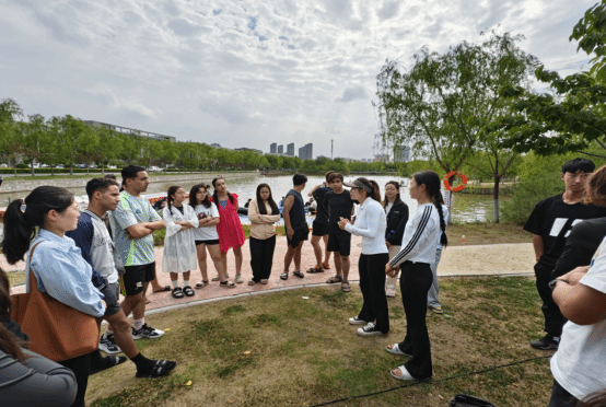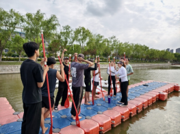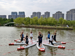 随后,同学们手持船桨在静思湖畔跃跃欲试,赵瑀琦为学生详细讲解水上桨板瑜伽注意事项和安全事宜,外国语学院研究生、留学生和体育学院学生进行了充分交流沟通。交流结束后,同学们身着轻便服装,手持桨板,来到湖中央进行活动。在赵瑀琦的专业指导下,同学们在桨板上练习瑜伽动作,他们屏息凝神、呼吸均匀,缓慢地跟随老师舒展身体,变更各种瑜伽姿势,共同展现了这项水上运动的独特魅力。活动间隙,留学生们还分享自己国家的运动和故事,增进了中外学生对彼此的了解和文化间的交流。此次海洋嘉年华桨板瑜伽活动不仅是一次体育活动,更是一次文化间的对话,不仅锻炼了学生们的身体,更拓宽了视野、增进了友谊。